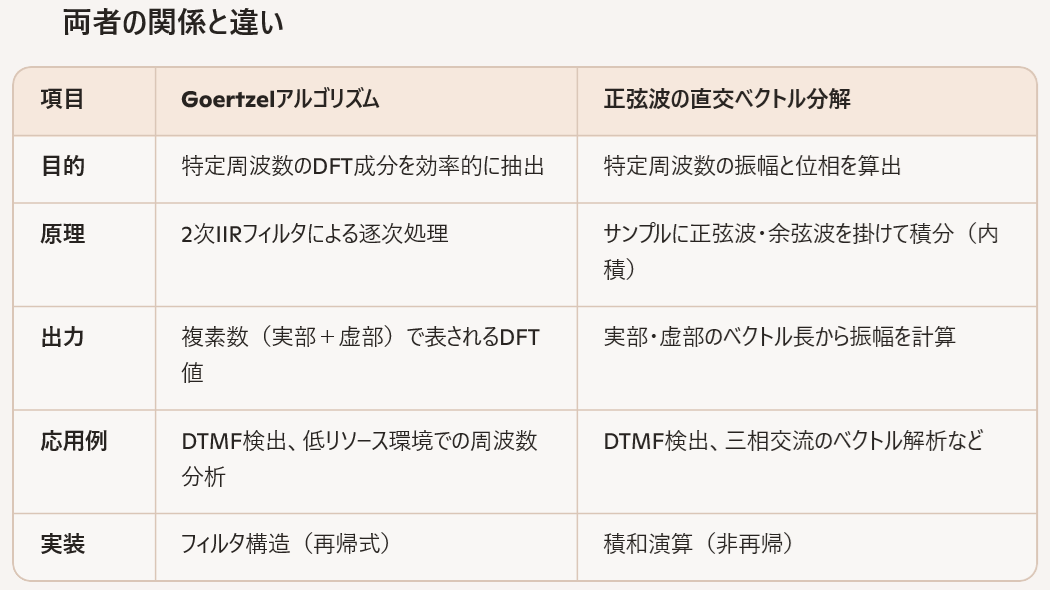 AIに「Goertzelアルゴリズムと正弦波の直交ベクトル分解は同じものですか?」 と訪ねてみたところ、次のような回答があり、比較表まで表示してくれました はい、基本的な原理は同じですが、表現や実装の観点が異なります。 両者は「特定周波数成分の抽出」において本質的に同じ処理を行っています。 ![]() |